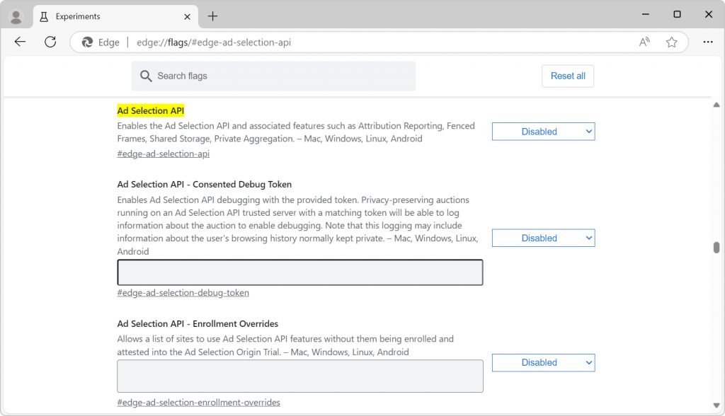 IT之家援引博文报道,微软目前已经邀请开发者测试该 API,可以在地址栏上输入“edge://flags#edge-ad-selection-api”,来启用该 API。